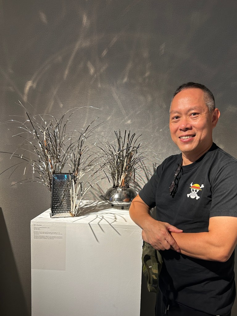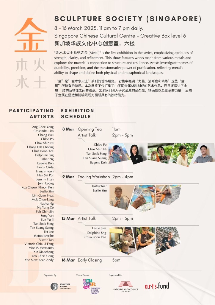The theme for this year’s Sculpture Society of Singapore show was Metal, being the first of five elements of Metal, Wood, Fire, Water and Earth. The event was held at the Singapore Chinese Cultural Centre and I participated with an artwork titled Sifting Ties Grating Connections.
